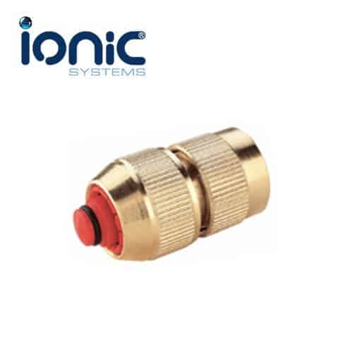 Brass quick release female fitting for ½-inch hose with an auto-stop mechanism. This fitting is compatible with standard hozelock style male connectors.