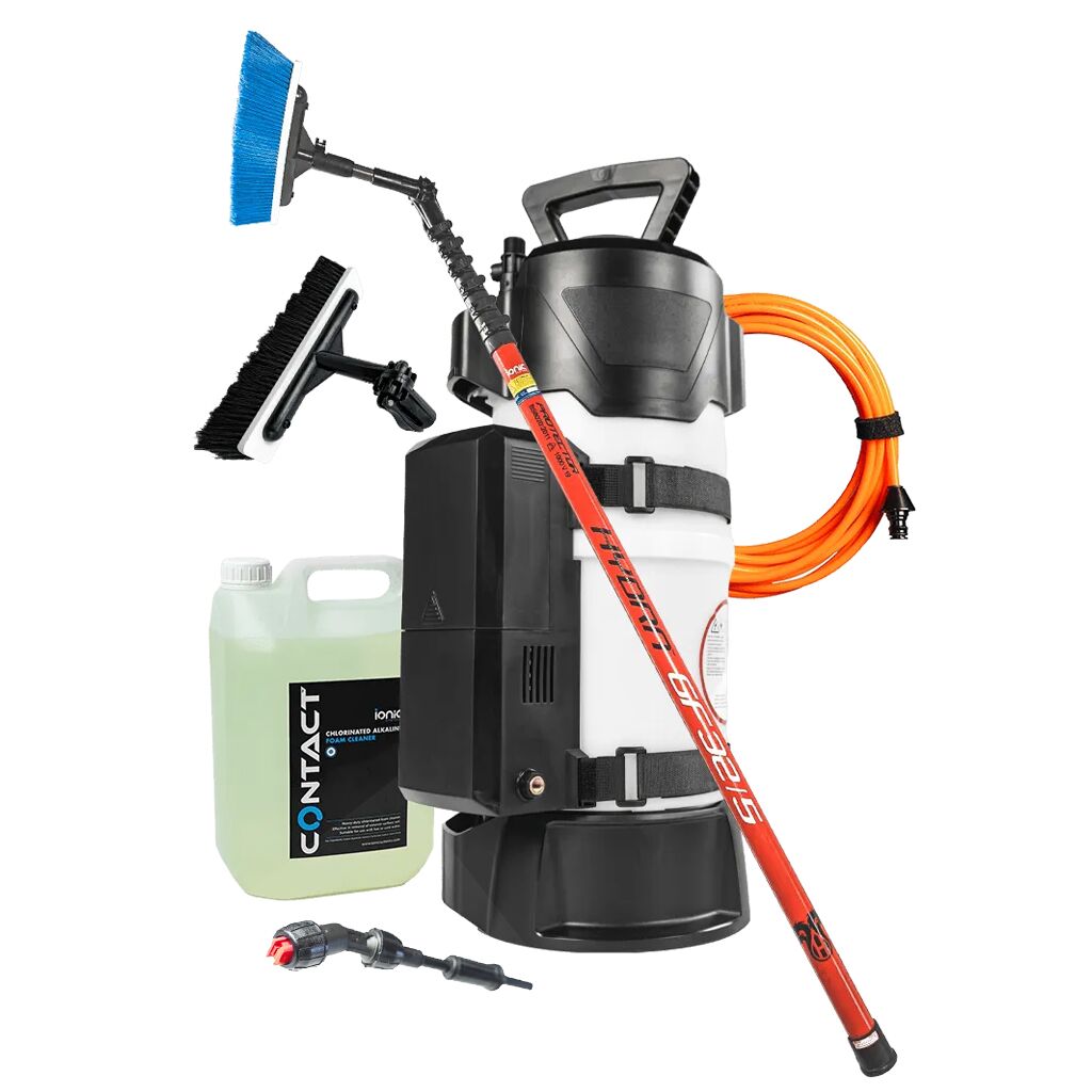 The Constant Flow Kit from Ionic Systems delivers safe, effective Soft Washing straight from the ground. Using a built-in compressor, it applies chemical as a controlled foam for precise coverage and longer dwell time — ideal for treating render, plastics, and delicate surfaces. With no chemicals passing through pumps, it’s easy to clean and switch between products. Compatible with telescopic poles and cladding brushes, it allows assisted agitation on render and textured surfaces for superior results. Lightweight, portable, and easy to operate, the Constant Flow Kit is the perfect entry into professional Soft Washing for residential and commercial cleaning.