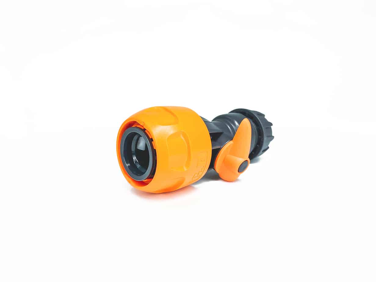 Female quick release hozelock style female hose fitting for ½ inch hose with flow regulator.