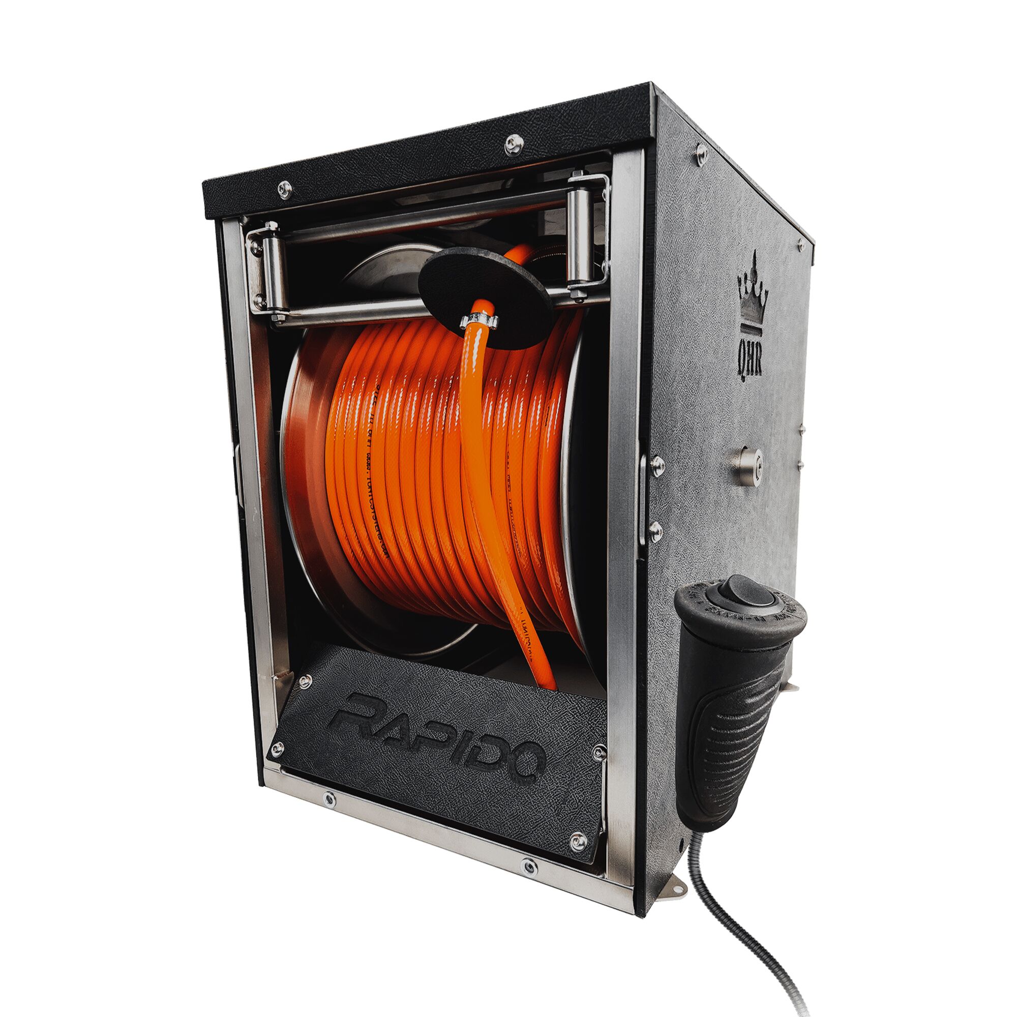 The Rapido™ Reel can hold up to 100m of either 6mm or 8mm RX hose, which can be quickly and effortlessly reeled, and is housed in a sleekly designed encasement. Rapido™ has the assistance of a belt-driven motor. The battery-powered, low torque, high-speed motor, allows the hose to be reeled onto the spindle at rapid speed, allowing operatives a time and effort-saving benefit over manual reeling.